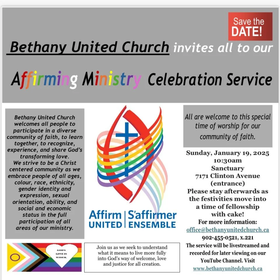 On Sunday, December 8, 2024 our community of faith voted in favour of becoming public, intentional, and explicit about our commitment to embracing all people in the full participation of all of our ministry. We celebrated this achievement in a worship service on Sunday January 19, 2025, where we were presented a certificate of membership with the Affirm United/S’affirmerEnsemble.